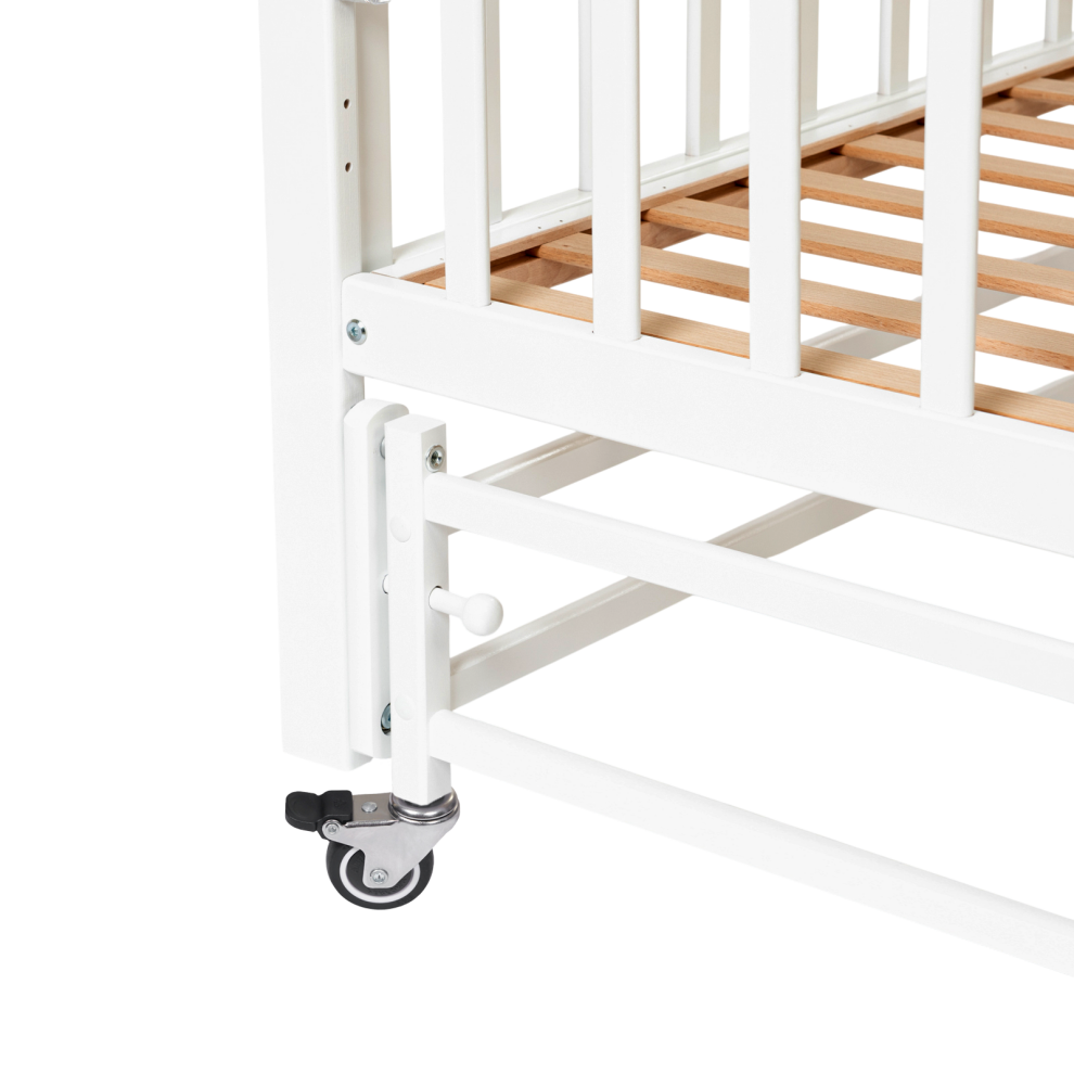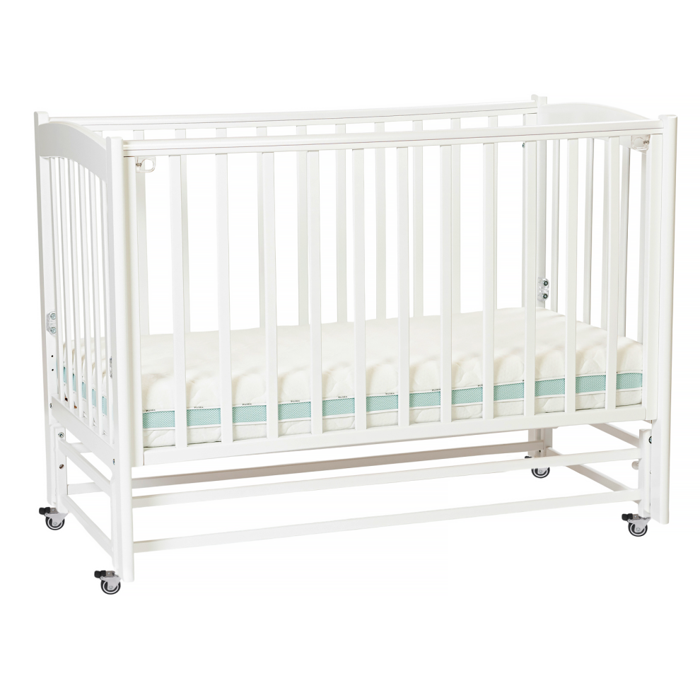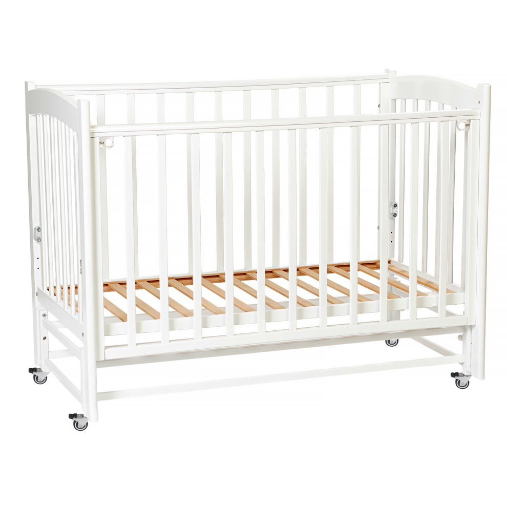 Для удобства мамы, боковая стенка кровати регулируется в трех положениях по высоте. Ложе так же регулируется в трех положениях по высоте, а продольный маятник имитирует качание малыша на руках. В комплект входят колёса для удобства перемещения кроватки по комнате (цвет колёс может меняться).