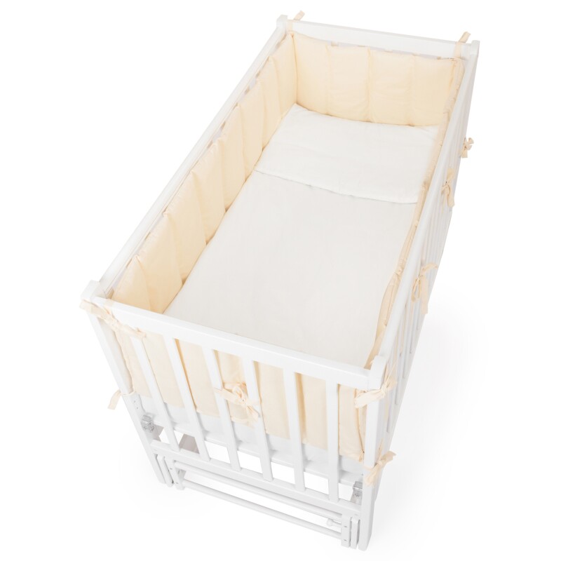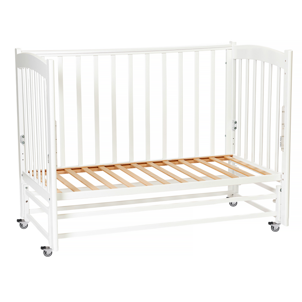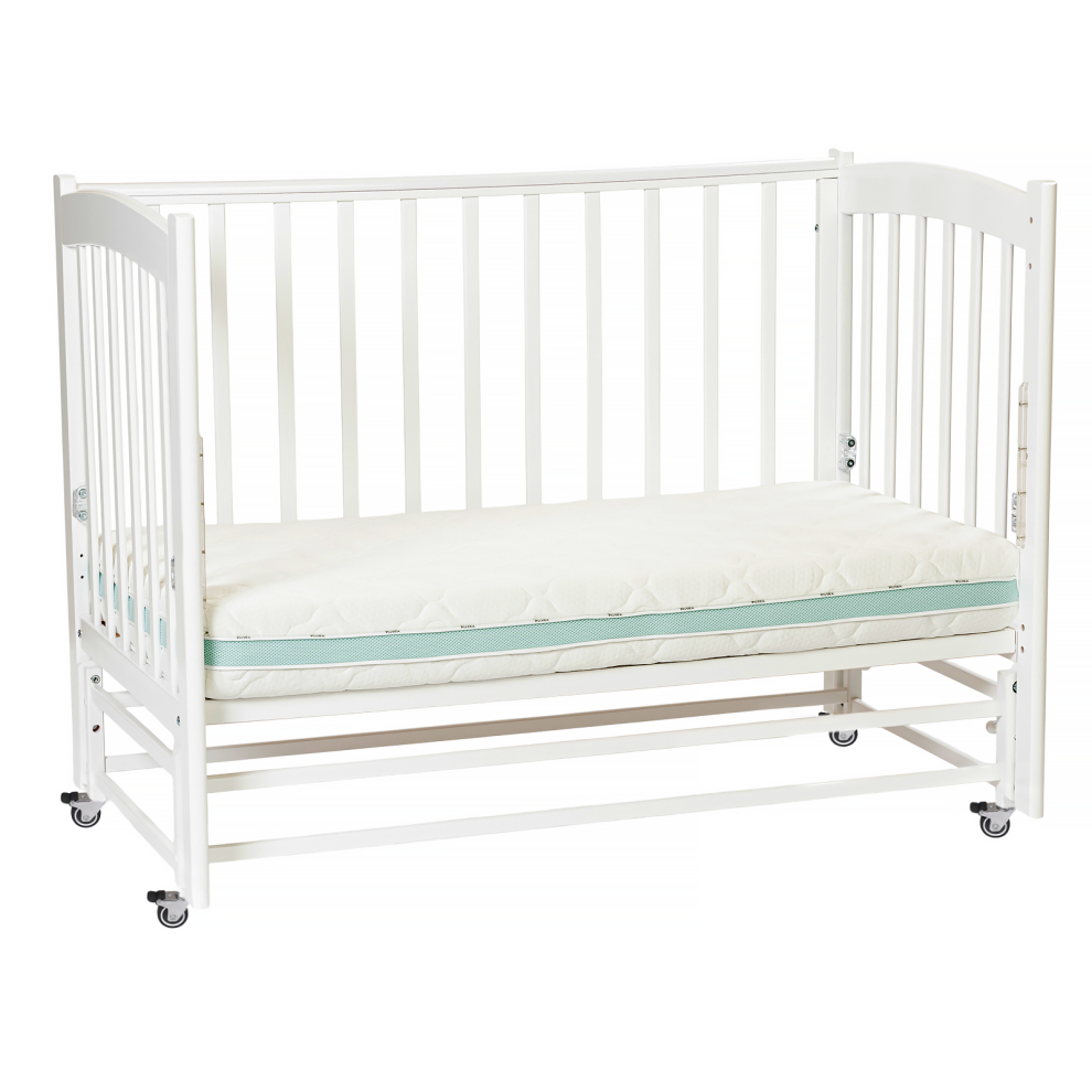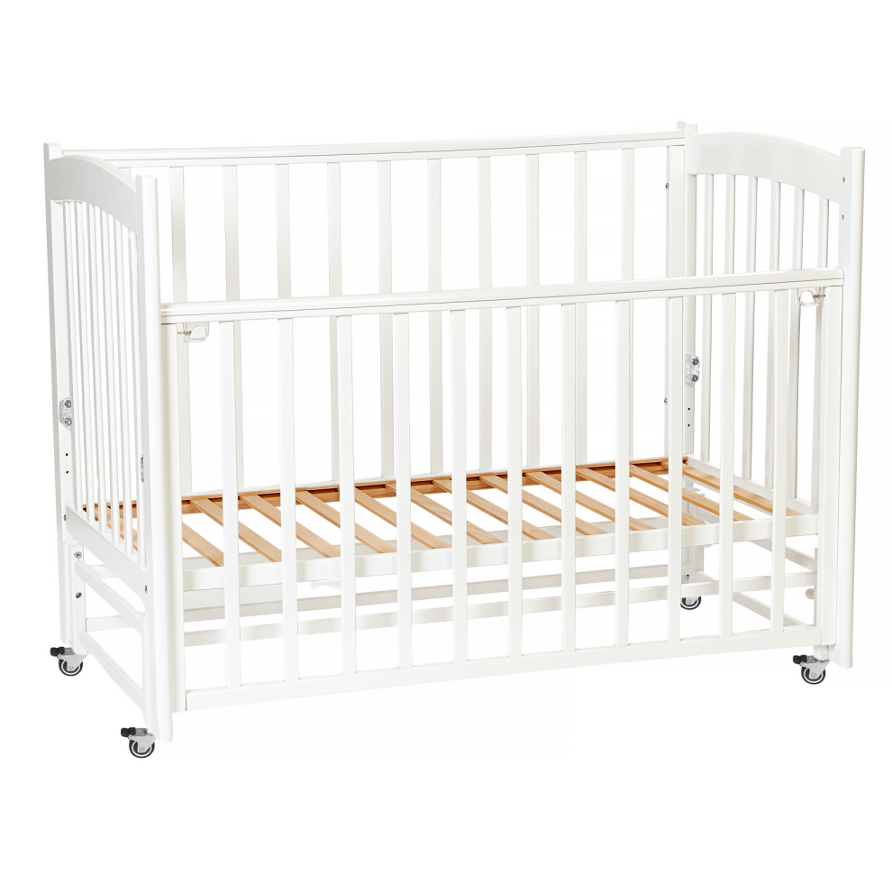 Для удобства мамы, боковая стенка кровати регулируется в трех положениях по высоте. Ложе так же регулируется в трех положениях по высоте, а продольный маятник имитирует качание малыша на руках. В комплект входят колёса для удобства перемещения кроватки по комнате (цвет колёс может меняться).