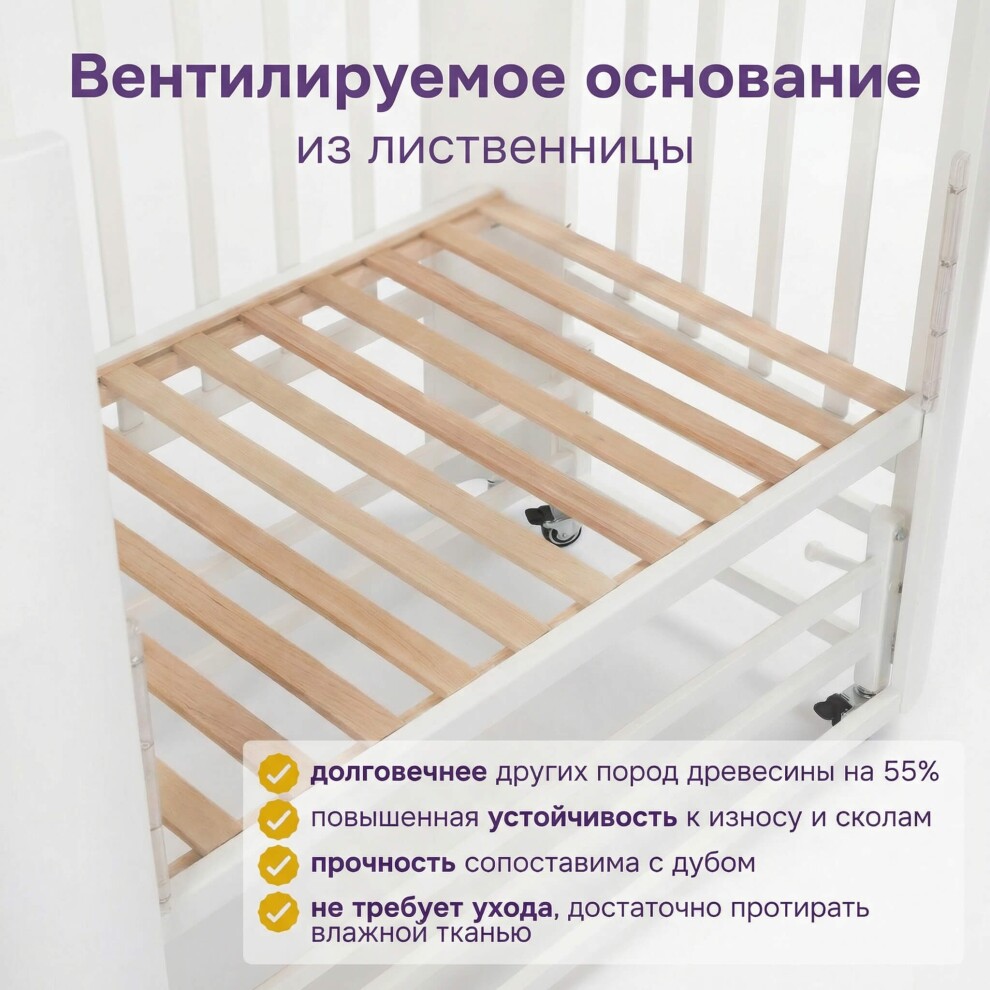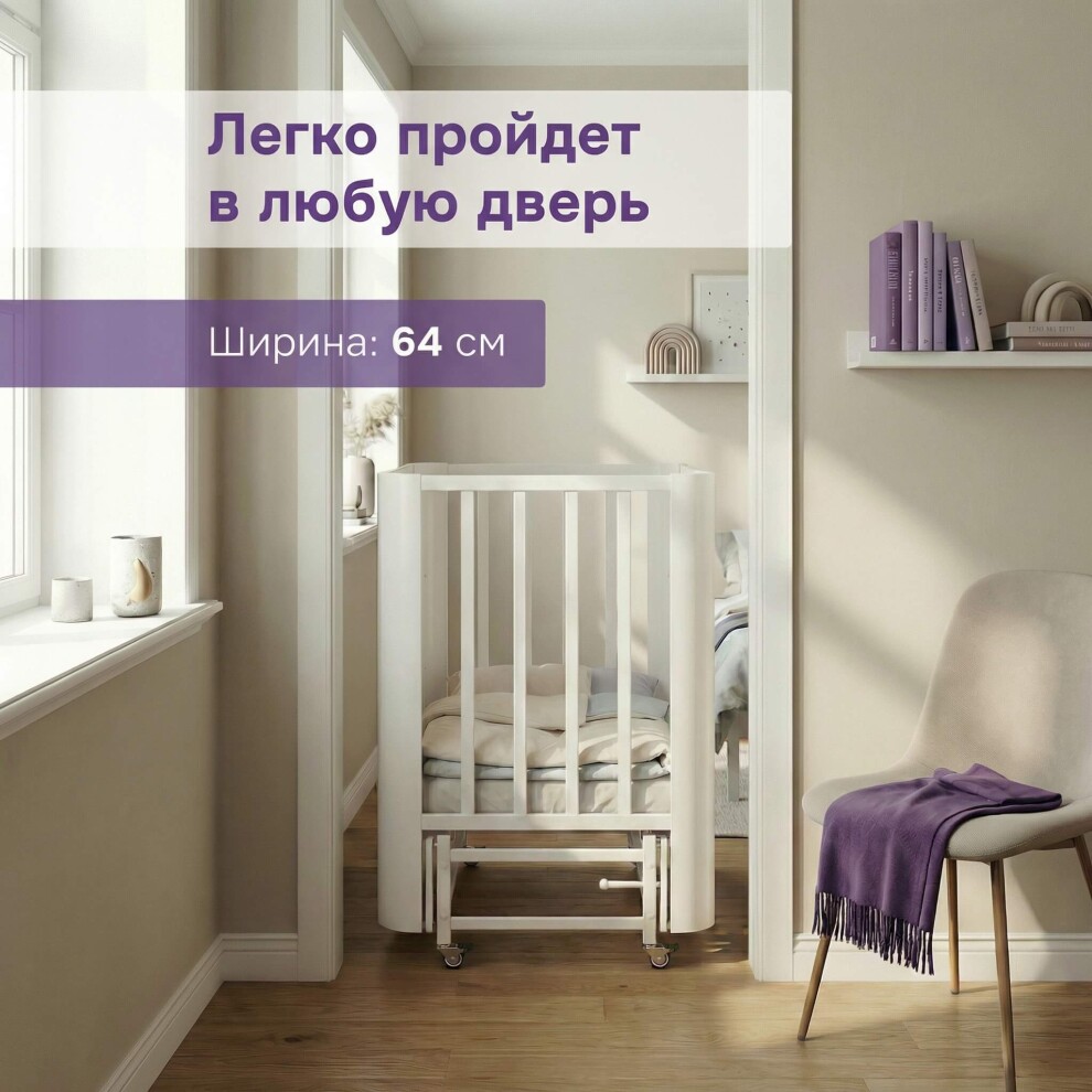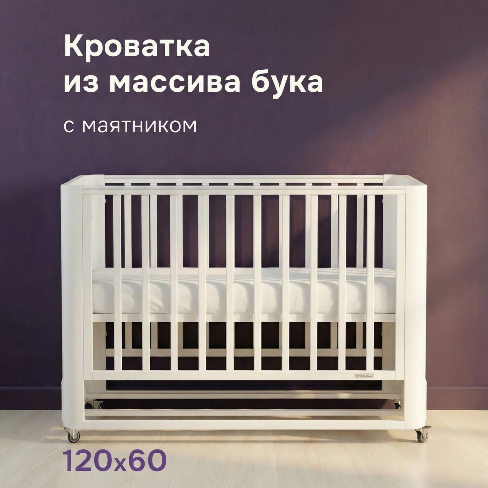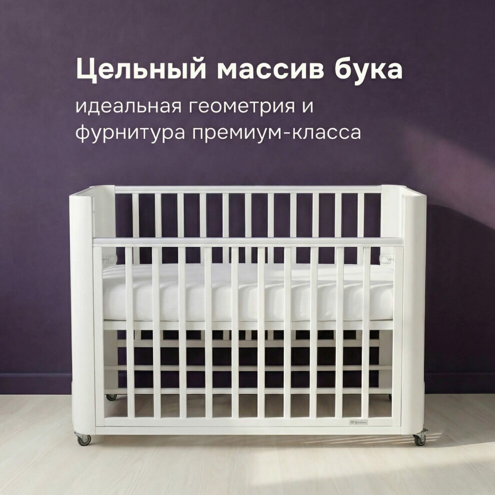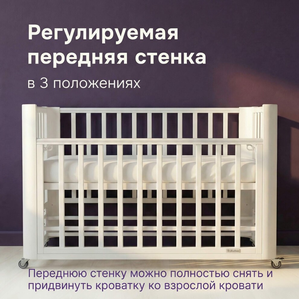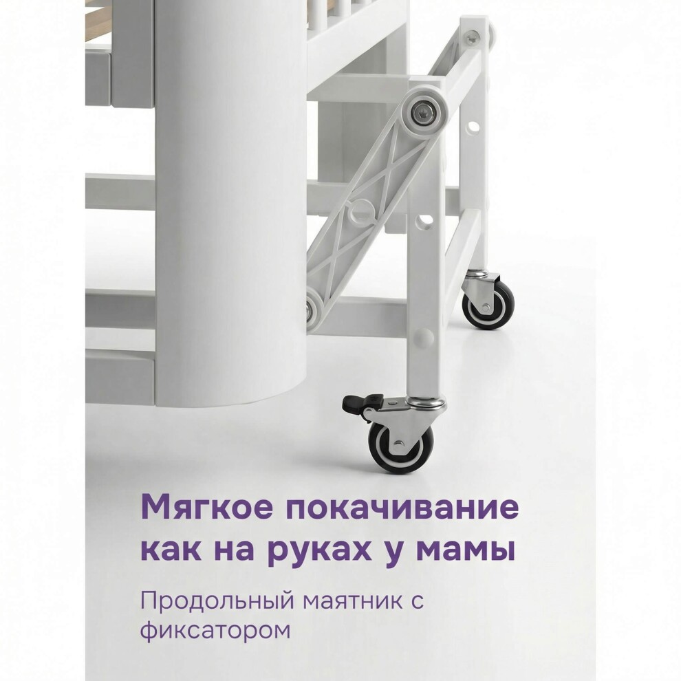 Кроватка легко превращается в классическую отдельностоящую — достаточно отсоединить от взрослой. Маятниковый механизм продольного качания помогает укачать малыша без усилий.