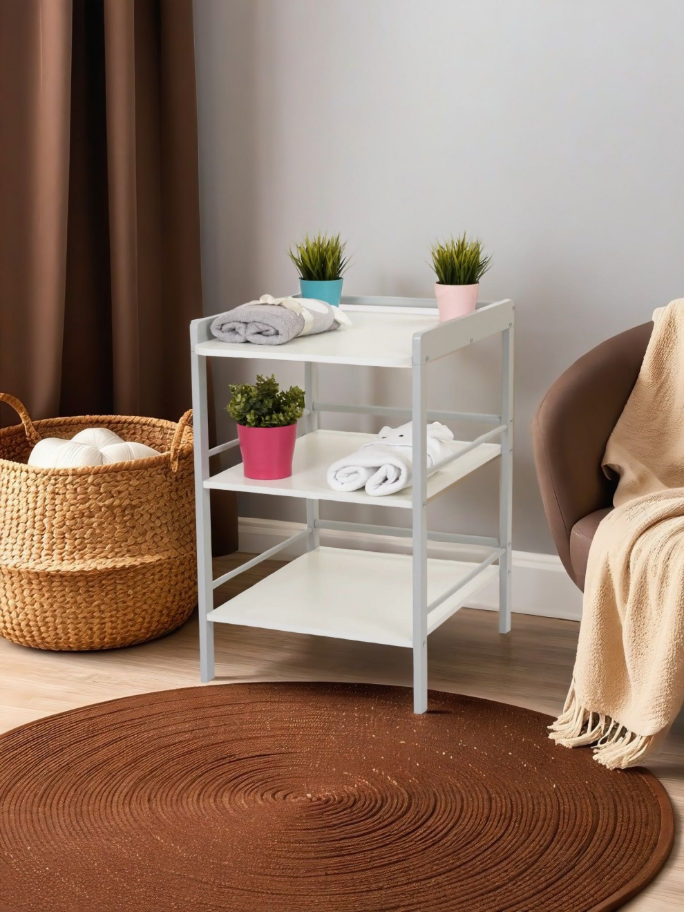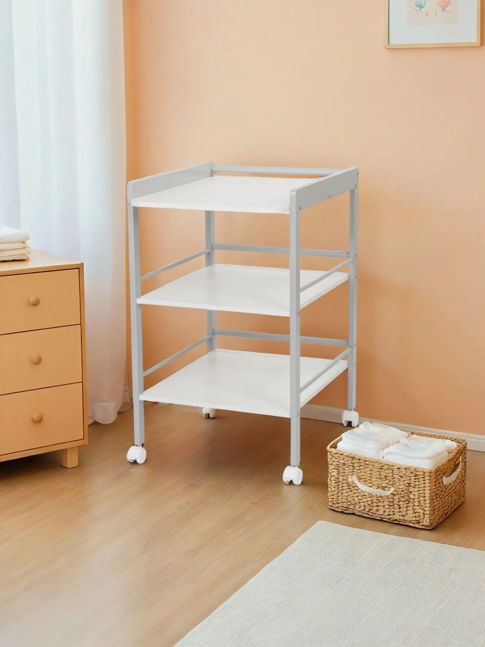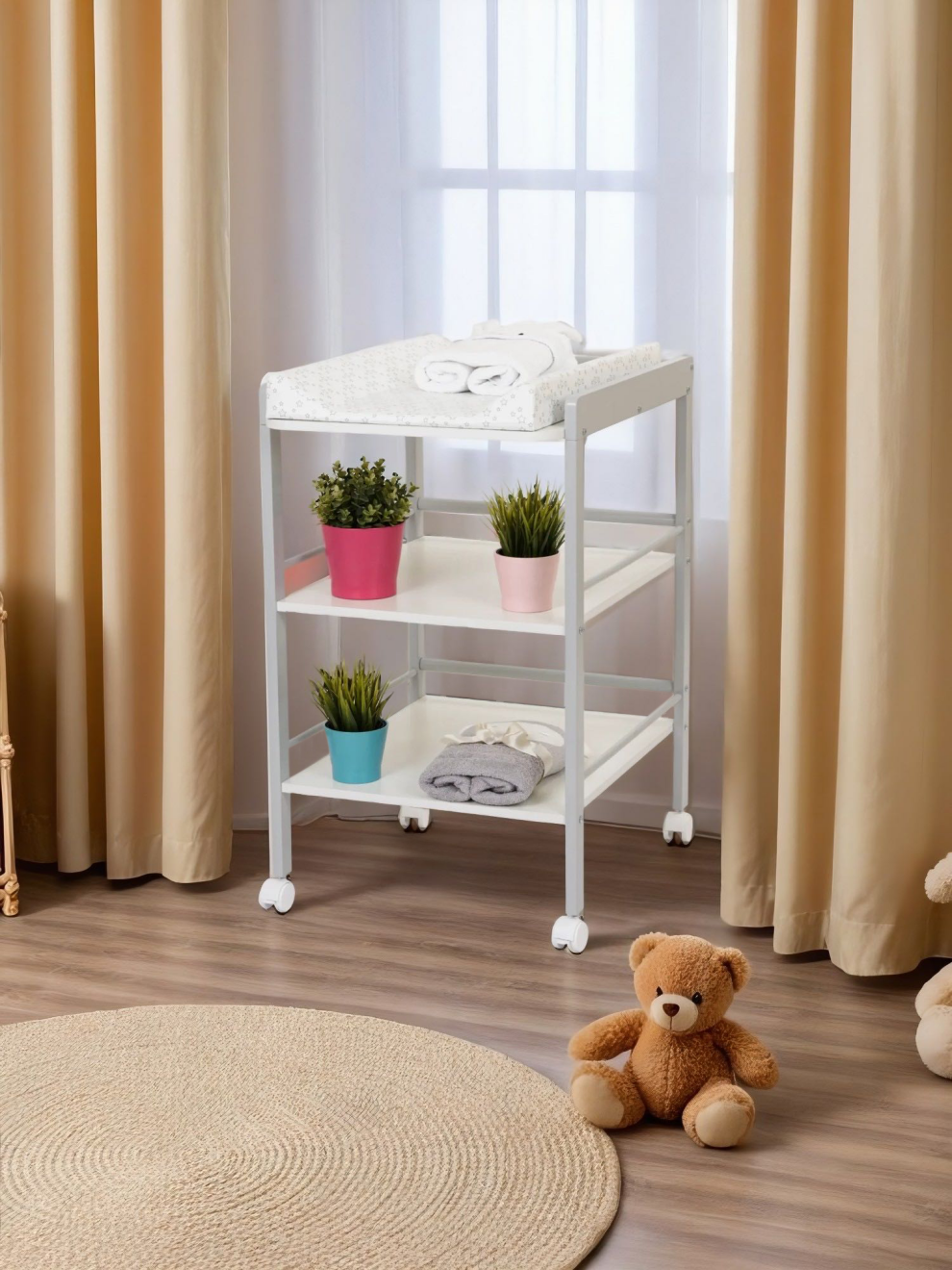 Три вместительные полки вмещают подгузники, кремы, одежду и игрушки — всё, что нужно маме, всегда рядом. Боковые вешалки удобно использовать для полотенец или пелёнок.